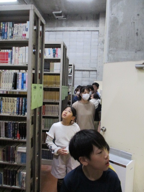 普段は見ることができない図書館のウラ側をめぐる今回のツアー。クイズを楽しんだ後、いざバックヤードツアーに出発!郷土資料室では虫よけのにおいに多少クラクラしながらも、昔(80年前)の国語の教科書や、明治時代の書物をみんなで見学。閉架書庫では、開架スペースに置ききれない本だけでなく過去の新聞や雑誌なども保存していることを知ってもらいました。見学後は、自分の本に透明のブックフィルムを貼るという体験もしてもらいました。