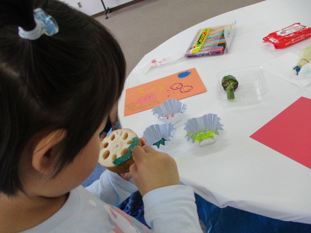 本物の野菜に絵の具で色をつけ、それを画用紙にスタンプし、自分だけのオリジナルアートを制作しました。私たちも見本を制作しましたが、子どもたちの発想には驚かされるばかり…!断面でスタンプするのではなく、まさかの側面でスタンプ!れんこんの断面をレインボーに!?やさいが恐竜になったぞ!なかには芸術家タイプの子もいましたね!(≧ω≦。)最後には「楽しかった!」というお声もいただけて嬉しい気持ちです꒰◍ᐡᐤᐡ◍꒱ご参加いただきありがとうございました!