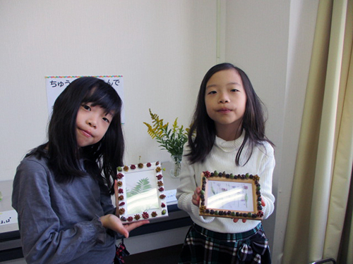 中央公園で拾ったどんぐりやまつぼっくり、椿の実や種を貼り付け、オリジナルフォトフレームを作りました。出来上がった作品を乾かす時間には「中央公園おさんぽビンゴ」にも挑戦してもらいました。公園で見つけられるものを探してビンゴを目指しました。